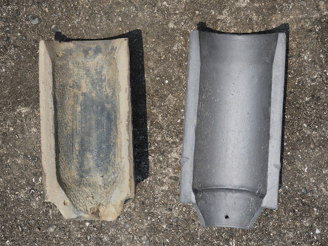 左の、鎌倉時代の瓦は、ヘラで中をすき取っているのがわかります鎌倉時代は、当然、全て手作りですから歪んでいます