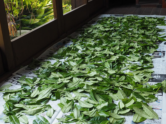 庭先にお茶の木が4,5本あります柔らかな新葉を摘み取って一晩乾かししんなりさせますそれを、よく揉んでしわくちゃにし、ざるに入れ濡れタオルで包んで、それを黒ビニールにつつんで日向にだして発酵させようとしていたのですが、昼ごろ雨がぱらついたので、ホットプレートの上において新聞紙でくるんで7,8時間発酵させました