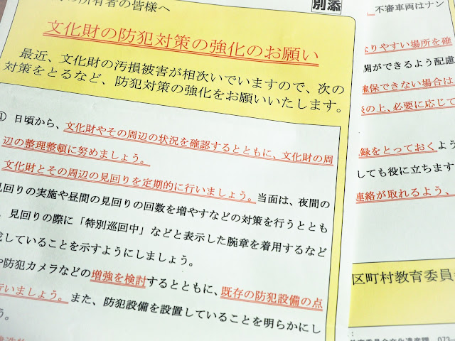 文化庁、警察、県、市の連名で文書が来ました異例といっていいです地元の警察署からも、すでに同様の注意書を書面でいただいていますし、警察の担当者と直接の打ち合わせも数回しています文化財建造物に油状のものをかける事案が多発していることをうけてのことと思います細かな手口は実行犯だけが知っているわけですから、報道することはできませんが、文化財所有者には、わかっている範囲で説明されています周到に計画されていて、思いつきや、出来心で出来る方法ではないです天台宗には文化財が多いですから、ちょっとした会議でも、出席者の半数くらいが文化財所有者です先日、天台宗のある会合に出席したら、被害にあった寺院もあったし、警察と連携して警戒強化をしている寺院もありました