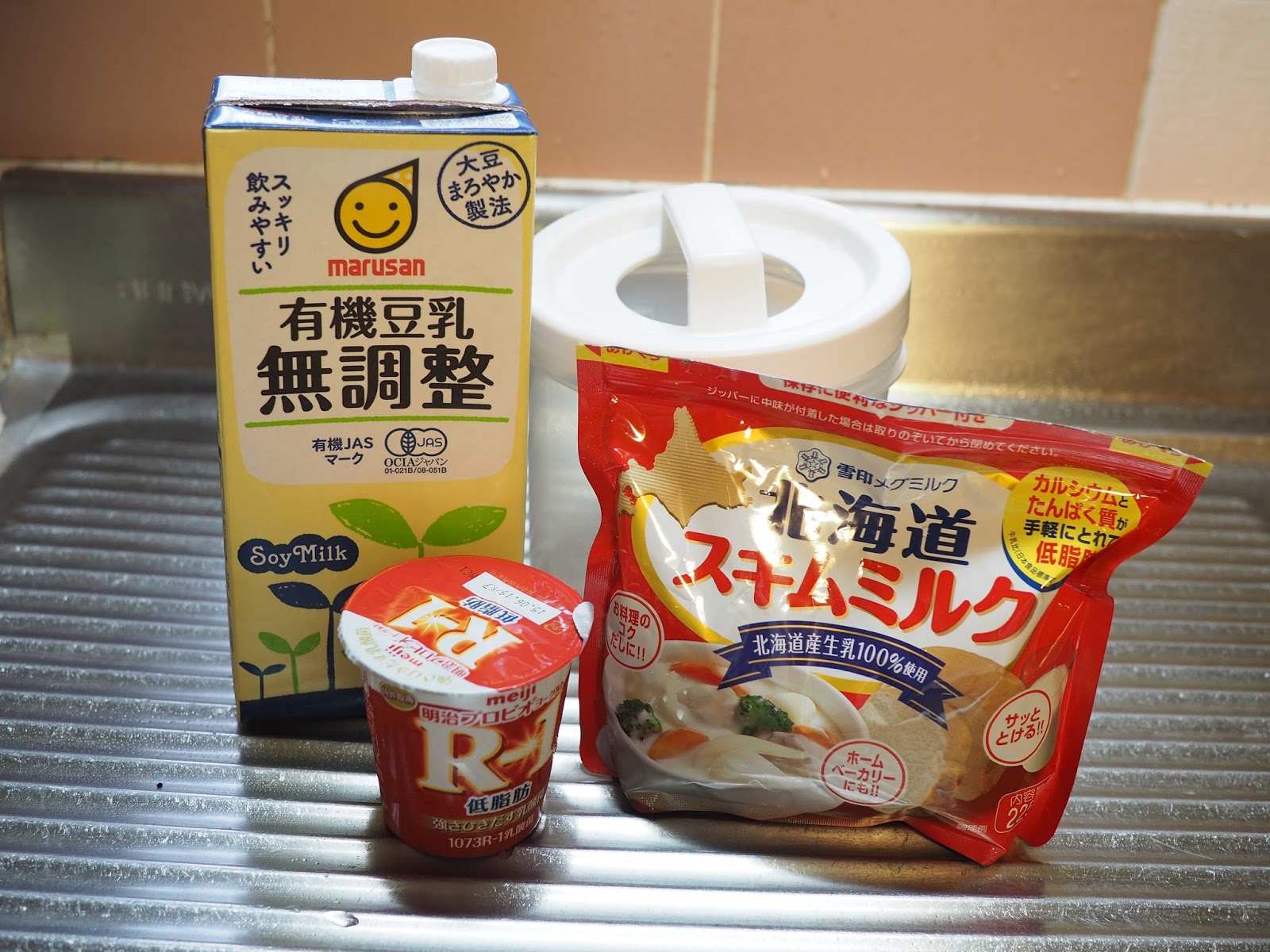 豆乳ヨーグルトの作り方ですヨーグルトは、無調整牛乳で作るのが一般的ですが、豆乳で作ることもできます豆乳で作ると、イソフラボンが含まれているのが、メリットですただ、カルシウムが無いそこで、スキムミルクで補いますスキムミルクは、必ず、雪印のものを使用してください雪印のスキムミルクは、冷たくてもよく溶けて塊になりません豆乳は、マルサンの有機豆乳無調整「大豆まろやか製法」を使用します飲むだけだとわかりませんが、ヨーグルトにすると、実際にまろやかに仕上がりますこれは、好みによります種のヨーグルトは、うちではR-1を使うことが多いです