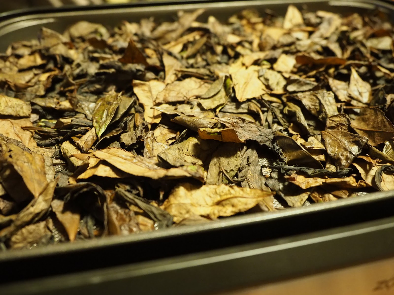 庭先にお茶の木が4,5本あります柔らかな新葉を摘み取って一晩乾かししんなりさせますそれを、よく揉んでしわくちゃにし、ざるに入れ濡れタオルで包んで、それを黒ビニールにつつんで日向にだして発酵させようとしていたのですが、昼ごろ雨がぱらついたので、ホットプレートの上において新聞紙でくるんで7,8時間発酵させました